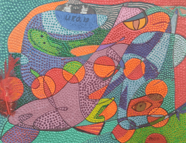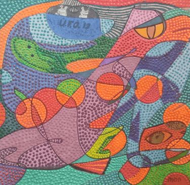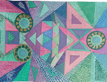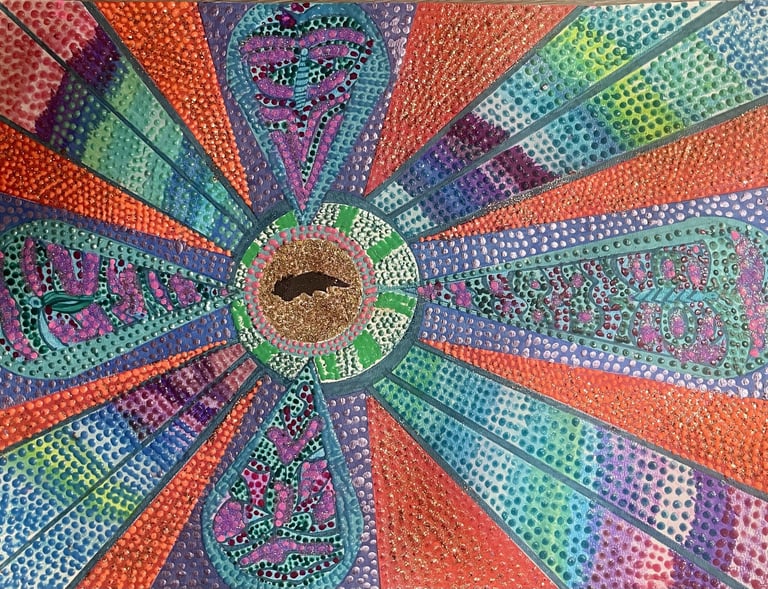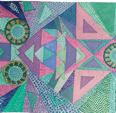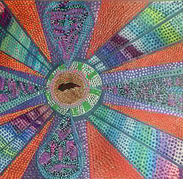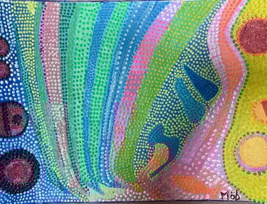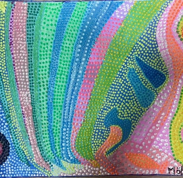 Art as motion, memory, and repetition. J. Möbius builds her worlds with Sharpie markers, puffy paint, and paper, layering color and texture into looping forms that never quite resolve. Each piece carries her signature tension between chaos and control—evidence of a hand that refuses perfection but demands meaning.
